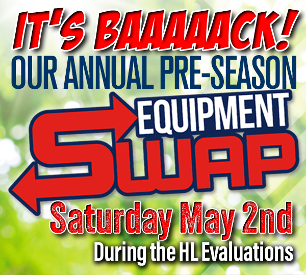 During our House League Evaluations, on Saturday May 2nd from 9:00am to 2:00pm and Sunday May 3rd from 10:00am to 12:00pm, bring your gently used gear and swap it for something that fits!